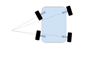 NOTE, that the equations are undefined when \( \alpha = \beta \) because the rotation point is effectively infinity. You should set both front tires to have the same angle as \( \beta \) and the rear tires to have the same angle as \( \alpha \) when the delta \( \alpha – \beta \) is very small.